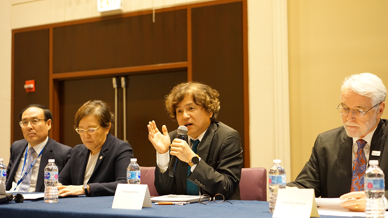 우리 학교 박형주 총장이 한미과학기술학술대회에 참석해 우수교원 확보에 나섰다. 우리 학교는 지난 14일부터 17일까지 미국 시카고에서 열린 한미과학기술학술대회(이하 UKC, US-Korea Conference on Science, Technology and Entrepreneurship)에 참가해 학교 홍보부스를 마련했다. UKC는 매년 KESA 주관으로 개최되는 재미 한인 과학자 컨퍼런스로, 올해에는 연구원과 Post-doc 등 한인과학자 1,000여명이 참석했다.박형주 총장은 '대학 리더십 포럼' 패널로 참여해 오세정 총장(서울대), 김혜숙 총장(이화여대), Robert Zimmer 총장(시카고대) 등과 함께 를 주제로 토론했다. 우리 학교 윤일수 교수(교통시스템공학과)는 포스터 세션에 참여해 우수 연구자 초빙을 위한 홍보를 진행했다.한편, 우리 학교 교원팀은 이남수 아주대 시카고 동문회장(Unisource America 사장, 공업경영학과 79학번)을 비롯해 시카고 지역에 거주 중인 동문 모임을 열고 격려하는 자리를 가졌다. ■사진, 왼쪽부터 △김형준(기계공학과, 15학번) △이남수(공업경영학과, 79학번) △박형주 총장/△박정순(건설시스템공학과, 98학번) △박지혜(건축학과, 97학번) △이지환(산업공학과, 99학번)