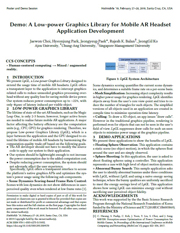 우리 학교 정보통신대학 구성원들이 속한 연구팀이 HotMobile 2019 학술대회에서 'Best Demo Paper Award'를 수상했다. 우리 학교 최재원(컴퓨터공학과, 석박통합과정), 박현정(소프트웨어학과) 학생과 고정길 교수(소프트웨어학과)를 비롯해 백정엽 중앙대 교수, Rajesh Krishna Balan 싱가포르 경영대학 교수는 한 팀을 이뤄 지난달 27일부터~28일 양일간 미국 산타크루즈에서 열린 학술대회에 참가했다.연구팀은 사용자의 인재 패턴을 기반으로 모바일 증강현실 콘텐츠를 저전력화하는 기술을 개발해 이를 학술대회에서 시연했다. 해당 논문의 제목은 이다. 우리 학교 최재원 학생은 "본 상을 수상하게 되어 영광"이라며, "앞으로도 이와 같이 그래픽스와 모바일 컴퓨팅 분야를 접목시키는 연구를 더욱 더 열심히 해나가겠다"고 말했다. HotMobile 학술대회는 ACM SIGMOBILE에서 공식적으로 주최하는 학술교류 행사로, 올해 25회째를 맞았다. 특히, 이동형 컴퓨팅 기술 관련 논문들이 발표되고 있는 우수 학술대회로 꼽히고 있다.