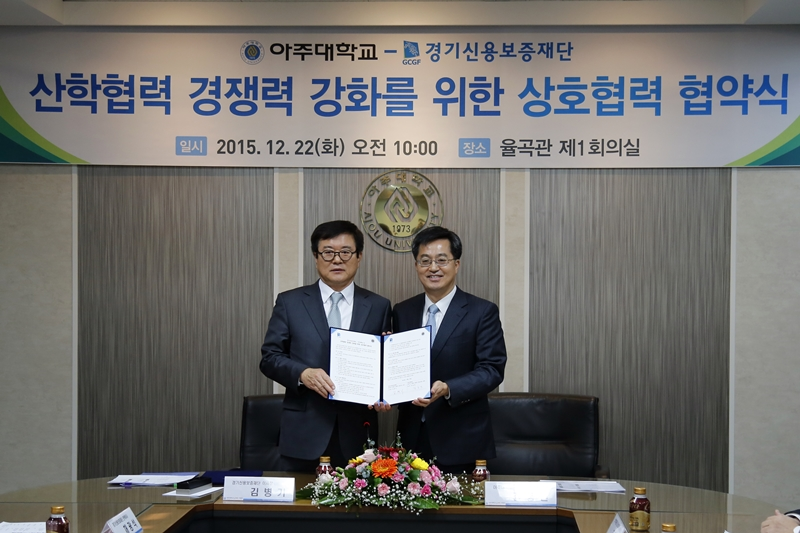 우리 학교와 경기신용보증재단이 산학협력 경쟁력 강화를 위한 업무협약을 체결했다. 22일 우리 학교 율곡관에서 열린 협약 체결식에는 김병기 경기신용보증재단 이사장과 김동연 총장, 최경희 산학부총장 등 관계자 20여명이 참석했다. 이번 협약 체결은 지역경제 활성화를 통한 지역산업의 발전과 산학협력 선도모델 창출을 위해 진행됐다. 경기신용보증재단은 아주대 교수나 학생 창업자, 산학협력단 창업보육센터 입주기업 및 산학협력 가족회사 등에게 보증 지원과 경영지도 자문, 각종 금융 업무 지원을 실시할 계획이다. 양 측은 또 ▲창업마인드 함양교육 참여 및 취·창업 연계 현장실습교육 활성화를 통한 우수인재 양성 ▲산학협력 공동연구 및 사업화 지원연계 기술개발의 상호협력과 성과 확산 ▲협의체를 통한 구성원들의 교류 등에 적극 협력하기로 했다. 한편 경기신용보증재단은 이날 협약식에서 우리 학교에 “AFTER YOU” 기금으로 1000만원을 기부하기로 약정했다.