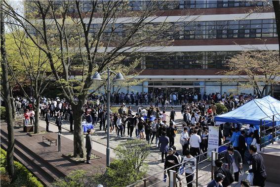 ‘링크(LINC)빵’ 나눠주기 행사가 21일 오후 중앙도서관 광장에서 진행됐다. 중간고사 기간을 맞은 학생들을 위해 김동연 총장이 직접 빵과 우유를 나눠주며 격려했다. 중앙도서관 광장에 마련된 행사부스에는 1400여명의 학생들이 찾아와 성황을 이뤘다. 김동연 총장과 조재형 학생처장이 학생들에게 간식을 전달했다. LINC사업과 관련한 학생참여 프로그램 책자도 배포됐다. 김동연 총장은 학생들 모두에게 일일이 이름과 학과를 물어보면서 ‘시험 잘 보라’는 격려의 말을 전했다. 김 총장과 함께 사진을 촬영하거나 포옹을 하는 학생들도 있었다. 이날 행사는 1시간30분 가량 이어졌다. 총학생회와 LINC사업단은 중간고사 기간에 재학생들을 격려하고 산학협력 선도대학(Leaders in INdustry-college Cooperation, LINC) 육성 사업을 홍보하기 위해 이번 행사를 마련했다. 아주대는 지난해 교육부가 주도한 LINC 사업에 선정됐다. LINC 사업은 산업체 수요에 부합하도록 대학교육의 체질을 개선해 대학과 지역(기업)의 경쟁력을 강화한다는 목적으로 2012년 교육부가 시작한 국책사업이다. *관련보도-티브로드 경기뉴스 "어려운 취업전선, 산학협력으로 해결"