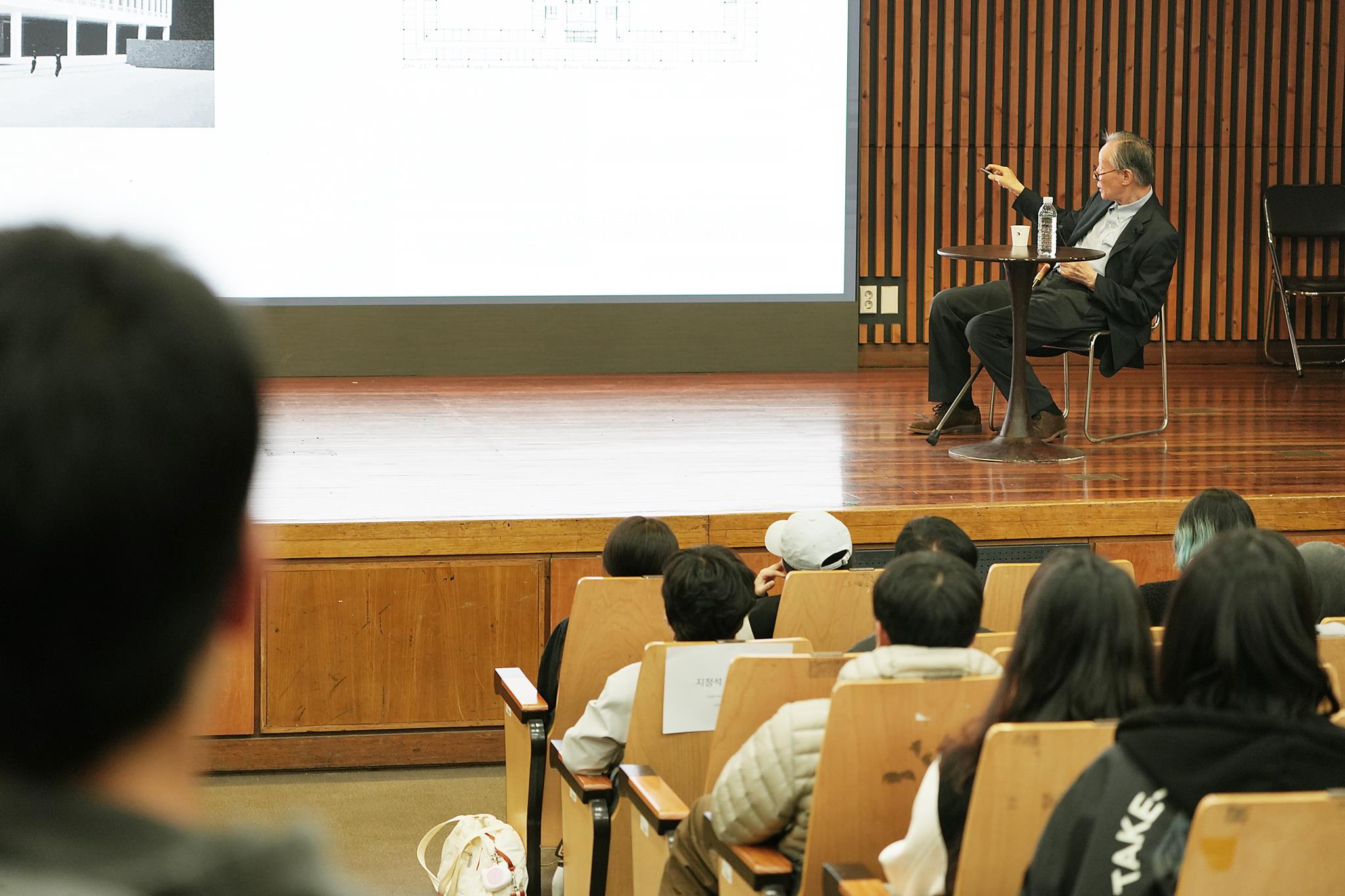 원로 건축가는 ▲학부와 대학원 재학 시절 완성했던 프로젝트들 ▲미스 사무실에서 실무자로 일하며 경험한 에피소드 ▲프로젝트 진행 과정에서의 고민과 결과 등을 직접 준비한 이미지 자료들을 기반으로 풀어냈다.