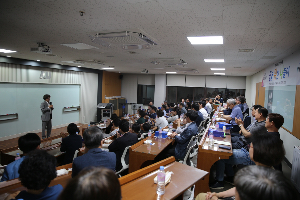 역자와의 토크쇼로 진행된 1학기 마지막 '총장 북클럽'에 지역 시민들이 함께했다. 우리 학교는 5일 정오 중앙도서관 1층 북카페에서 박형주 총장의 9번째 총장 북클럽을 개최했다. 이번 학기 마지막 북클럽에는 윤종록 가천대학교 석좌교수가 초청돼 참석자들과 토론 시간을 가졌다. 윤종록 교수는 미래창조과학부 차관 출신으로 '작은 꿈을 위한 방은 없다(저자: 시몬 페레스)'를 번역했다. 북클럽 선정도서의 원저자 '시몬 페레스'는 노벨 평화상을 수상한 인물로, 이스라엘의 아버지로 불리고 있다. 윤종록 교수는 시몬 페레스가 몸소 보여준 이스라엘의 '후르츠파 정신'을 참석자들에게 소개하며 도전 정신의 중요성을 강조했다. 윤종록 교수는 "뻔뻔함 혹은 당돌함으로 번역되는 어휘인 '후르츠파' 정신은 갈까말까 고민할 때 가고, 할까말까 고민할 때 행동하는 것"이라며 "오늘날 이스라엘을 창업국가의 모범 국가로 성장시킨 원동력"이라고 설명했다. 이어 윤 교수는 "새로운 것을 만드는데 필수적인 정신인 후르츠파 정신이 우리 사회 곳곳에 퍼져야 한다"고 말했다. 이에 박형주 총장은 "'내게 남은 후회는 더 큰 꿈을 꾸지 않은 것이다'라는 구절이 인상깊었다"며 "이스라엘은 자동차를 생산하지 못하면서 그 보다 더 상위 기술을 요하는 비행기를 만들어내는 나라라는 점을 눈여겨볼 필요가 있다"고 말했다. 박 총장은 "어떤 일을 접근할 때 기초부터 차근차근 준비하는 것도 좋지만, 때론 중간 단계를 과감히 뛰어넘을 줄도 알아야 한다"고 덧붙였다. 한편, ‘총장 북클럽’은 총장과 학생들이 한 권의 책을 미리 읽고, 정해진 날에 간단한 간식과 함께 하며 이야기를 나누는 모임으로, 지난 2015년 2학기부터 학기 중 매달 열리고 있다. 신청자 가운데 선착순 20명에게는 북클럽 선정 도서가 배부되고, 참석자 모두에게는 커피와 간식이 제공됐다. 우리 학교는 앞으로도 매 학기 1번씩 총장 북클럽을 저자와의 대화로 구성하고, 인근 지역 시민들을 초대할 계획이다.