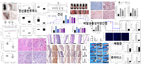 최상돈 교수와 김욱 교수를 비롯한 우리 학교 교수들이 참여한 연구팀이 자가면역·염증성 질환 치료제를 개발하는 데 성공했다. 연구팀은 전신홍반루푸스, 류마티스관절염을 비롯한 질환에 대한 치료 효과를 입증해냈다.관련 논문은 국제 학술지 <바이오매터리얼스(Biomaterials)> 3월17일자 온라인판에 게재됐다. 최상돈 교수(생명과학과·대학원 분자과학기술학과)가 교신저자로 참여했고, 김욱 교수(대학원 분자과학기술학과), 의대 서창희 교수(류마티스내과)와 김순선·정재연 교수(소화기내과)가 함께 했다. 우리 학교 샤 마사드 연구교수와, 경희대 강동병원 이상호 교수(신장내과)도 연구에 참여했다. 분자과학기술학과 대학원에 재학중인 김기영 학생, 아스마 아첵 학생도 공동 제1저자로 이름을 올렸다.연구팀은 자가면역·염증성 질환 펩타이드 치료제를 개발해 비알콜성 지방간염, 전신홍반루푸스, 류마티스관절염, 건선과 패혈증 질환에 대해 동물모델에서 치유효과를 입증해냈다.자가면역질환은 신체 조직이나 세포에 대한 비정상적 면역반응이 나타나 발생하는 질환이다. 전신홍반루푸스를 포함해 약 80여가지의 질환이 알려져 있다. 염증성 질환은 염증을 주병변으로 하는 질병의 총칭으로 비알콜성지방간염, 알츠하이머병, 패혈증 등이 포함된다.자가면역·염증성 질환의 초기 발병원인은 크게 두 가지다. 미생물과 병원체에서 유래된 물질에 의해 감염성 염증 반응을 일으키거나, 인체 내부 면역숙주에서 유래된 물질에 의해 비감염성 염증 반응을 일으키는 것. 모두 톨-유사 수용체의 부적절한 활성화로 생기는 반응이지만 이에 대한 이해나 기전 규명은 매우 부족한 상황이다. 이에 우리 학교 연구팀은 광범위한 톨-유사 수용체 제어능력을 가진 펩타이드(MIP2)를 발굴, 염증성 사이토카인 제어 기능을 확인해냈다.최상돈 교수는 “펩타이드(MIP2)를 투여한 질환동물모델에서 비알콜성지방간염, 전신홍반루푸스, 류마티스관절염, 건선과 패혈증 등이 치유되는 효과를 관찰했다”며 “이번 연구 이외에도 인플라마좀을 억제하는 신규 물질로 알츠하이머, 제2당뇨병, 다발성경화증 등 염증성 질환에 대한 유효성 연구를 진행하고 있다”고 설명했다.이번 연구는 보건복지부 연구중심병원 육성 R&D 및 과학기술정보통신부와 한국연구재단이 지원하는 기초·원천연구지원 사업의 지원으로 수행되었다.