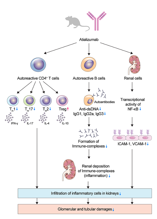 우리 학교 박상규 교수 연구팀이 자가면역질환인 루푸스 신염 치료를 위한 인간화 항체를 개발했다. 박상규 교수(약학과)는 19일 연구팀이 개발한 '항-AIMP1 인간화 항체'가 루푸스신염 동물모델에서 탁월한 치료효과를 나타냈다고 밝혔다. 이번 연구는 이상원 연세대 교수(의과대학 류마티스내과)와 공동연구로 진행됐다. 해당 연구는 저명 학술지인 에 8월 2일자로 온라인 게재됐다. 논문의 제목은 이다.루푸스 신염이란 자가면역질환인 전신성 홍반 낭창이 신장에 영향(염증)을 주는 것으로, 단백뇨와 신증후군, 급성신부전, 만성신부전 등의 질환으로 나타난다. 자가항체와 면역보체가 신장의 사구체내 축적이 루푸스 신염의 발달과 밀접한 연관이 있고, 수지상세포와 인터페론을 분비하는 자가반응 B세포가 루푸스 신염의 발병에 기여하는 것으로 알려져 있다. 또 자가반응성 T세포가 염증미세환경을 유발하고, 자가반응 B세포가 자가항체를 분비함으로써 루푸스 신염의 악화가 유발된다. 현재 루푸스 신염의 치료를 위해 클로코코르티코이드와 싸이클로포스파마이드 혹은 마이코피놀레이트 모페틸을 포함한 스테로이드와 면역억제제가 주로 사용되는데, 다양한 부작용 때문에 안전한 약물의 개발이 필요한 실정이다. 우리 학교 박상규 교수는 지난 20여년간 AIMP1을 연구해온 전문가로, AIMP1이 단백질합성효소 결합인자로서 다양한 기능을 한다는 사실을 뿐만 아니라, 저산소와 염증반응 등에 의해 세포밖으로 분비돼 염증을 악화시키는 인자임을 최초로 밝혔다. 연구팀은 자가 면역질환인 루푸스 신염 치료 연구에서 염증을 유발하는 물질로 알려진 AIMP1 싸이토카인이 질환의 발병 및 발달에 역할이 있을 것으로 가설을 설정하고 연구를 시작했다. 연구팀은 전신성 홍반낭창 환자의 혈액에서 AIMP1 싸이토카인이 증가된 것을 확인하고, 중화항체를 인간화 항체로 개발해 동물모델을 대상으로 치료 가능성을 살펴보고자 했다. 태어난 지 23주에 자발적으로 루푸스 신염질환이 발현되는 실험용 쥐에 항-AIMP1 인간화 항체를 주사해 ▲단백뇨 ▲사구체 손상 ▲항체의 사구체내 축적 ▲혈중 염증 및 항염증 인자의 분석 ▲혈중 항체 농도 ▲비장비대화, 비장내 면역조직염색 분석 ▲비장세포내 염증세포 및 항염증세포 등을 분석했다. 항-AIMP1 인간화 항체가 주사된 루푸스 신염 실험용 쥐는 ▲단백뇨의 감소 ▲사구체 손상 감소 ▲사구체내 항체 축적 감소 ▲혈중 염증인자 감소 및 항염증인자 증가 ▲신장비대증 완화 ▲신장내 염증 유발 면역 세포수의 감소를 보였다.박상규 교수는 “이번 연구를 통해 AIMP1 싸이토카인이 염증유발물질임을 검증하고, 루푸스 신염의 진행에 주요한 인자임을 확인했다"며 "항-AIMP1 인간화 항체 개발을 통해 동물모델에서 자가반응성 B세포 뿐만 아니라 자가반응성 T세포의 억제를 통해 루푸스신염 치료효과가 있다는 것을 입증했다"고 말했다. 이어 박 교수는 "항-AIMP1 인간화 항체가 기존 약물과는 달리 조절 T세포와 항염증 싸이토카인들을 증가시키는 것을 확인했기 때문에 추가 연구개발을 통해 루푸스 신염을 치료할 수 있는 새로운 면역조절 항체 치료제로 개발될 수 있을 것"이라고 덧붙였다.