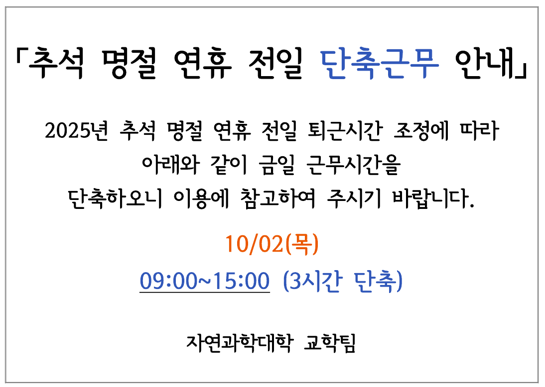 [사무] [자연대교학팀] 추석 명절 연휴 전일(10/02(목)) 교학팀 근무시간 조정 안내