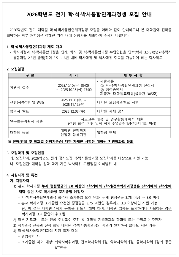 [자연대/대학원] 2026학년도 전기 학·석사연계과정생 (정시)모집 전형 실시 안내(10/10(금)~10/23(목))