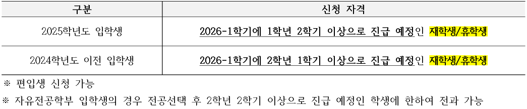 < 2026-1학기 재학생 · 휴학생 전과 신청 안내 >