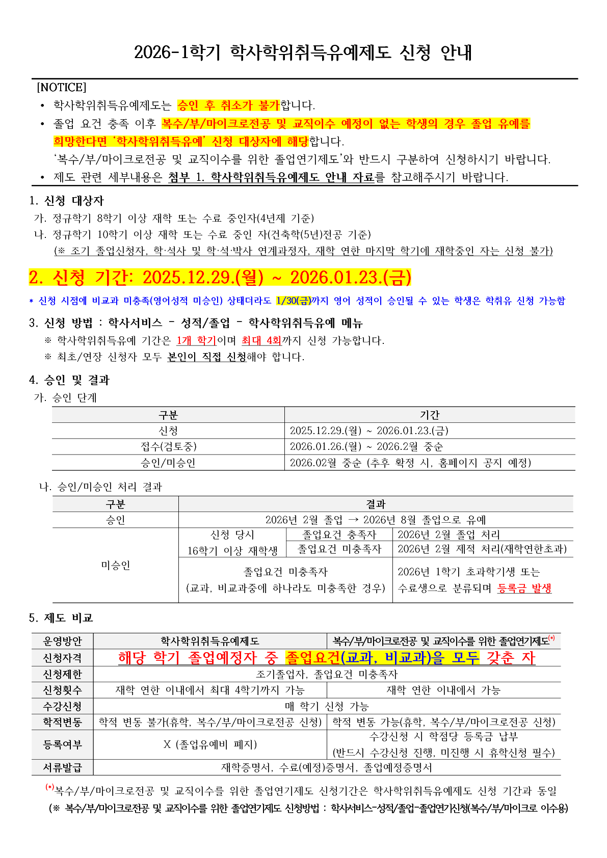 [학사] [학부][졸업]2026-1학기 학사학위취득유예(학취유), 졸업연기 신청 안내