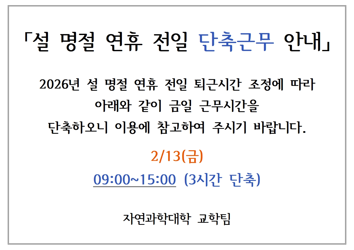 [사무] [자연대교학팀] 설 명절 연휴 전일(2/13(금)) 교학팀 근무시간 조정 안내