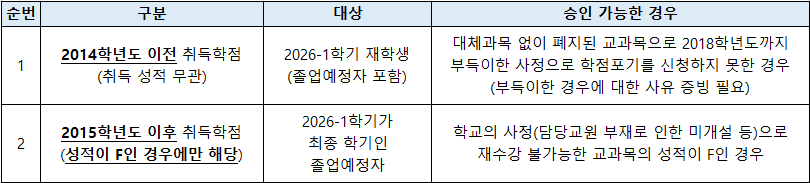 1. 학점포기 승인 대상 : 아래 2가지 중 하나에 해당할 경우