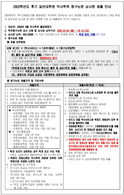 [학사] [자연대/대학원] 2025학년도 후기(2026년 8월 졸업예정자) 박사학위 청구논문 심사원 제출 안내