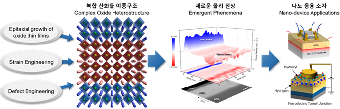 본 연구실에서는 복합 산화물 이종 구조에서 발생하는 독특한 전자적 상호작용(Electronic Interaction)과 그로 인해 발생하는 새로운 물리 현상을 연구한다.산화물의 구조를 원자 수준에서 제어하여 물성을 ‘디자인’하고,이를 실제로 구현하기 위해 펄스 레이저 증착 기술 (Pulsed Laser Deposition)을 이용하여 고품질 단결정 산화물 박막 이종 구조를 성장시킨다.정교하게 구현한 산화물 이종 구조의 전자기적 물성을 탐구하며, 이를 토대로 차세대 메모리,기능성나노 소자,아날로그 반도체 소자 등을 개발하는 응용 연구를 함께 수행한다.